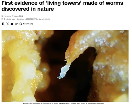 A 10-millimeter (0.4-inch) nematode tower twists and folds as the mass of worms reaches for the lid of its petri dish.