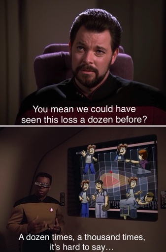 Lower Decks should have had an episode about memes, with the biggest, evilist meme just being that singular symbol that represents Loss. It became evil because, like the tar puddle that killed Tasha, it was forgotten after centuries of being alone on some random planet.