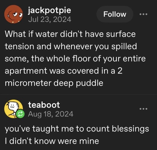 minus-square58008@lemmy.worldlinkfedilinkEnglisharrow-up3·5 months agoWhat if each H2O molecule was coated in a hydrophobic substance?