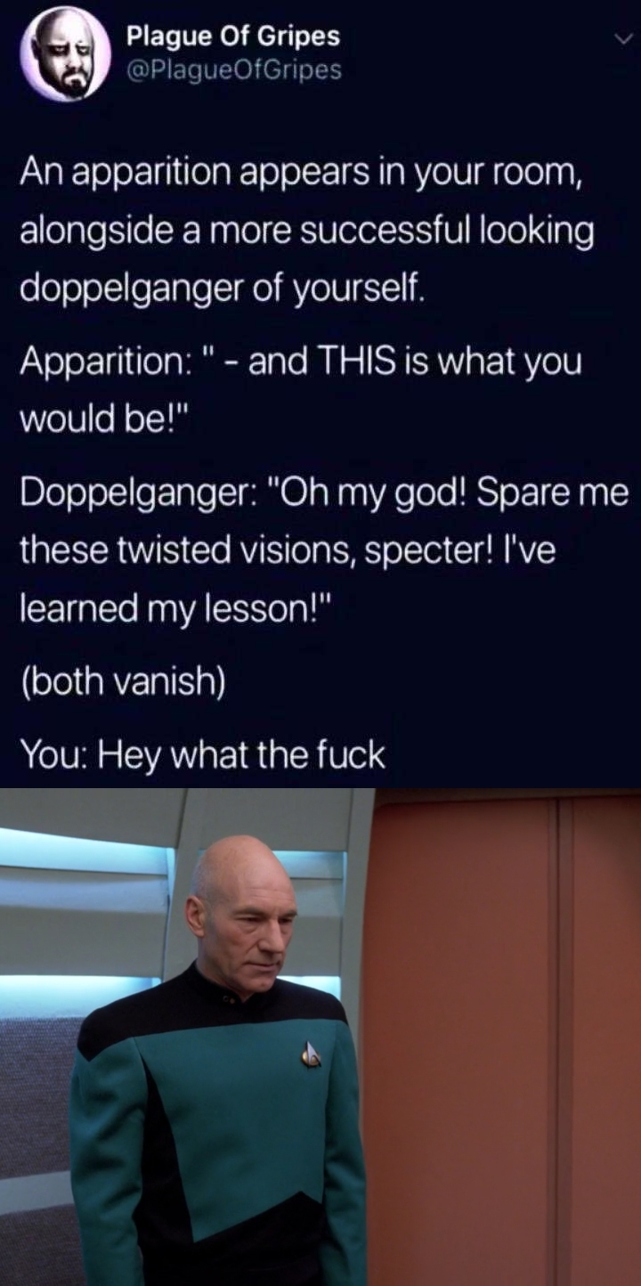 Like… did Q just re-create existence around him? Or did he pluck Prime Picards consciousness and dump it into the body of Beta Picard? I like to think it’s the latter with Beta Picard in the background just like “Wait… what? What’s happening?” and then Q and Picard fuck off leaving this poor dude to desperately rely on therapy for the next couple years.