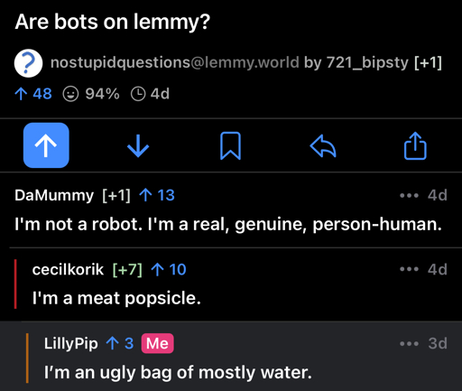 LillyPip@lemmy.ca to TenForward: Where Every Vulcan Knows Your Name@lemmy.worldEnglish · 1 month agoNot a bot.lemmy.caimagemessage-square23linkfedilinkarrow-up1172arrow-down16
