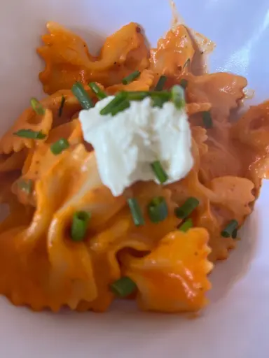 Unfortunately i dont have exact recipe as it was throw everything together type deal. I did start by roasting cherry tomatoes and butternut squash with olive oil and salt / pepper. Than i blended it and Added it to sauce pot , add crushed chili peppers flakes , black pepper, and goat cheese . Mixed in pasta and let than cook till heated . Topped with goat cheese and chives