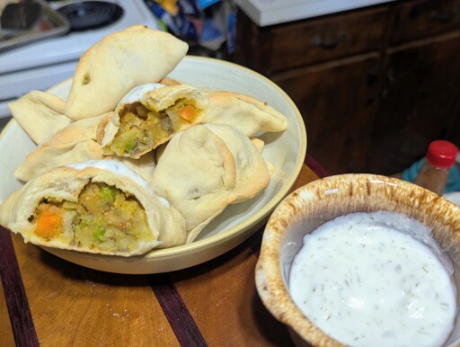 The filling is potatoes, peas, carrots, onion, mustard & cumin seed along with curry powder and granulated garlic.