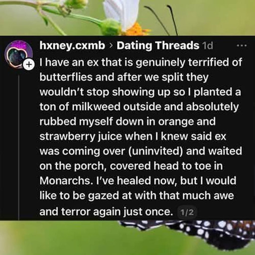 minus-squareglimse@lemmy.worldlinkfedilinkEnglisharrow-up86·5 days ago-a person terrified of butterflies -covered themselves in fruit juice?? -sat outside when the uninvited guest was coming over -became the butterfly god I’ve seen more believable stories in green text. The only reasonable part is planting milkweed