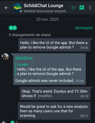 I downloaded SchildiChat to access matrix as their UI is more conveniant than Element. Exodus and TC slim however found “Google Admob” within the app.