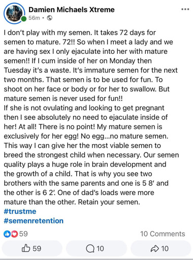This is only scratching the surface of the weirdness of semen retention advocates. Throwback to the Canadian political candidate who advocated for this a few years ago: