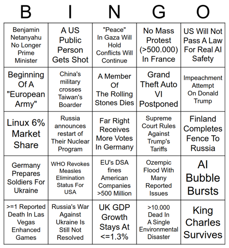 I recently saw someone creating a bingo chart for 2025 so I decided to create one for 2026 (image of this post). What are your predictions for 2026?