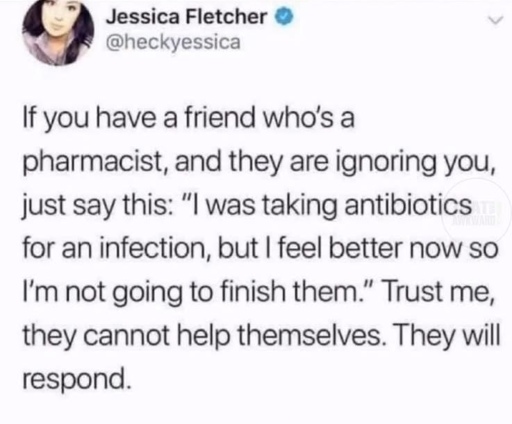 ickplant@lemmy.world to Science Memes@mander.xyzEnglish · 20 days agoLife pro tip for friends of pharmacistslemmy.worldimagemessage-square175linkfedilinkarrow-up11.23Karrow-down114