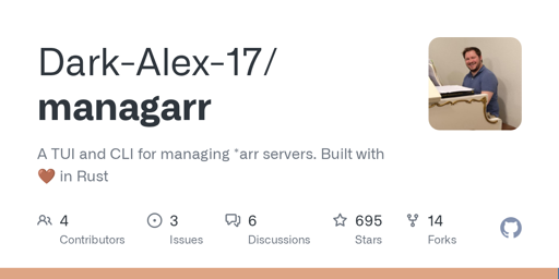 Managarr is a terminal-based application for managing all your Servarr instances from one place. It provides a user-friendly interface to interact with your media libraries, making it easier to manage your downloads, monitor your artists and albums, and perform various actions directly from the terminal.