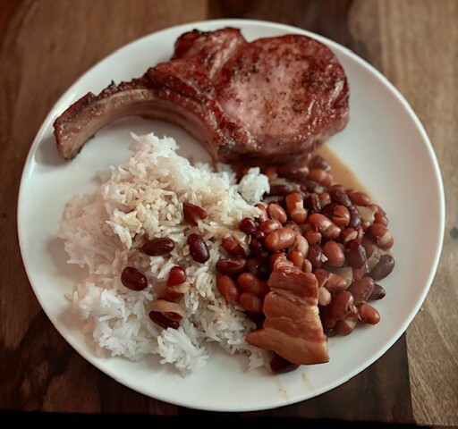 Brine cured pork chop with Thai Hom Mali rice and a curry masala of red and brown beans, Caribbean style salted pigtails and smoked pork belly. Masala made with Nandan Hindustani masala, cumin, Malay ketumbar, onions, garlic, coconut milk and madame jeanette peppers). Salad not pictured.