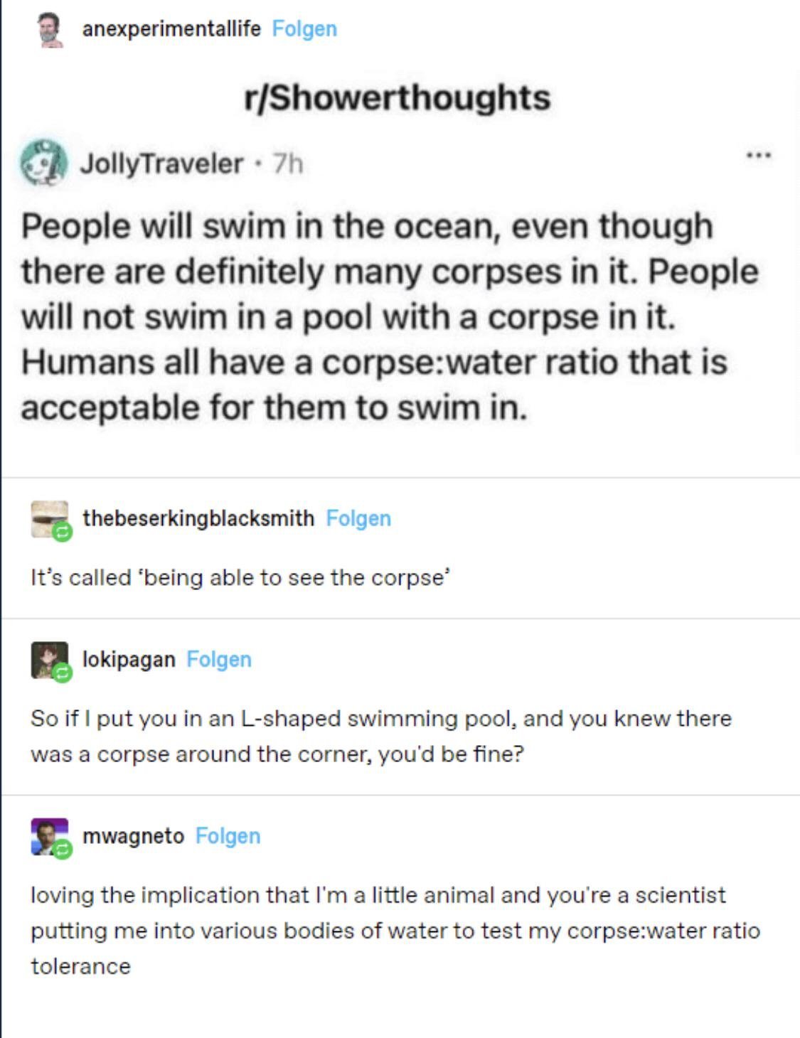 The whole premise of this meme is a bit silly. If there was a corpse floating near the beach, I think most people might wait for the corpse to be removed, and perhaps even a reasonable cause of death to be determined, before entering the local area. The same is true for pools.