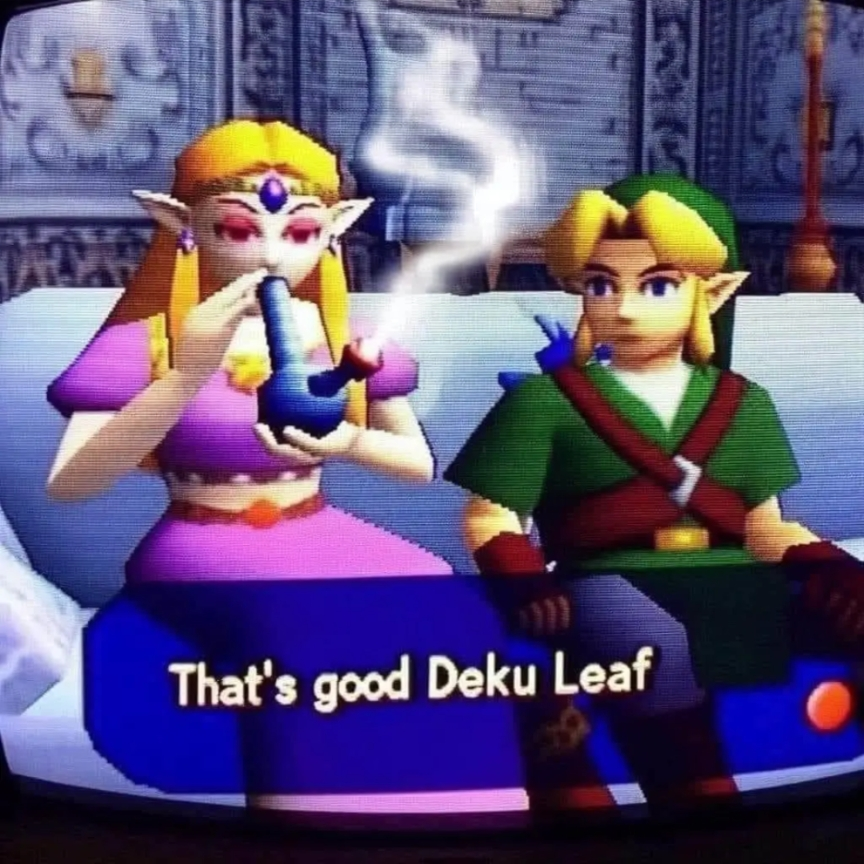 [alt text: an image of Link and Zelda sitting on a couch, which looks like a screenshot from a Nintendo 64 game. Zelda is smoking a bong, and there’s text on screen that says “That’s good Deku Leaf”.]