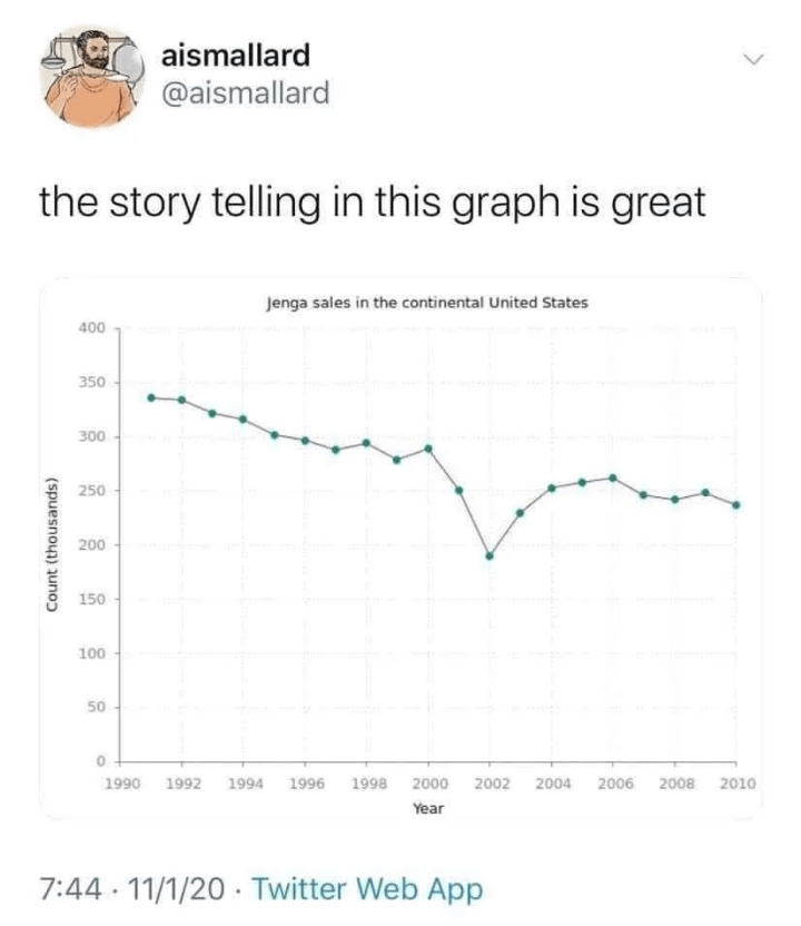 minus-squareTar_Alcaran@sh.itjust.workslinkfedilinkEnglisharrow-up14arrow-down1·1 year agoI also STRONGLY doubt over 200.000 Jenga sets are sold yearly in the US.