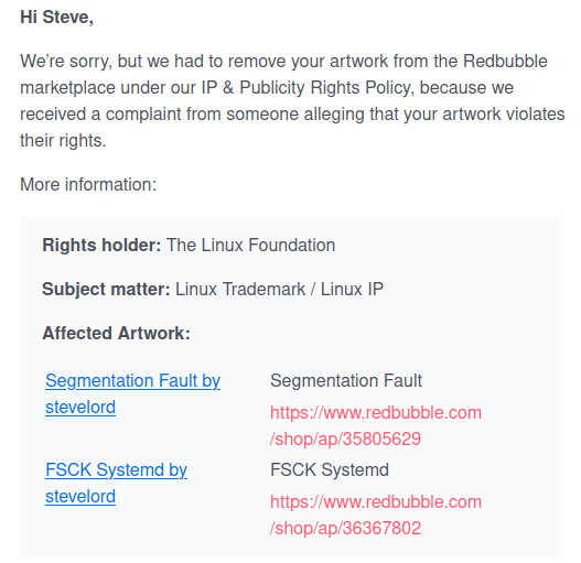 I agree. Of the 188 marks registered to “The Linux Foundation” with the USPTO, there does not appear to be a mark for “systemd”, “fsck”, or “segmentation fault.” My guess is this is an imposter claim and the artist should counter notice this claim to Redbubble.